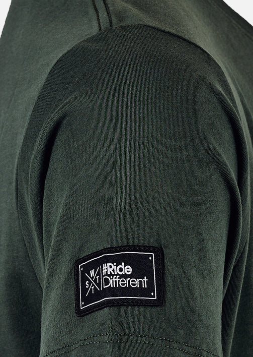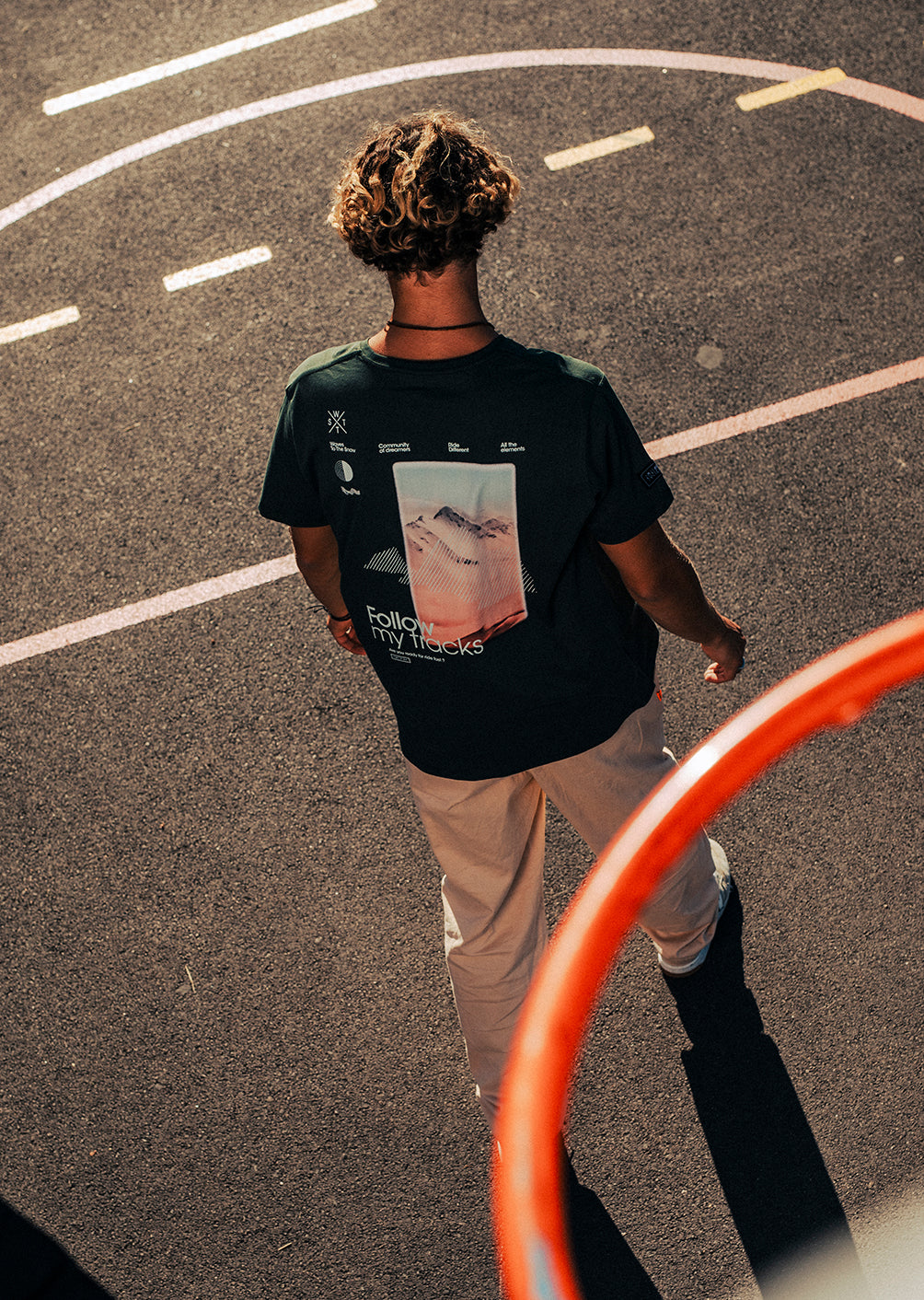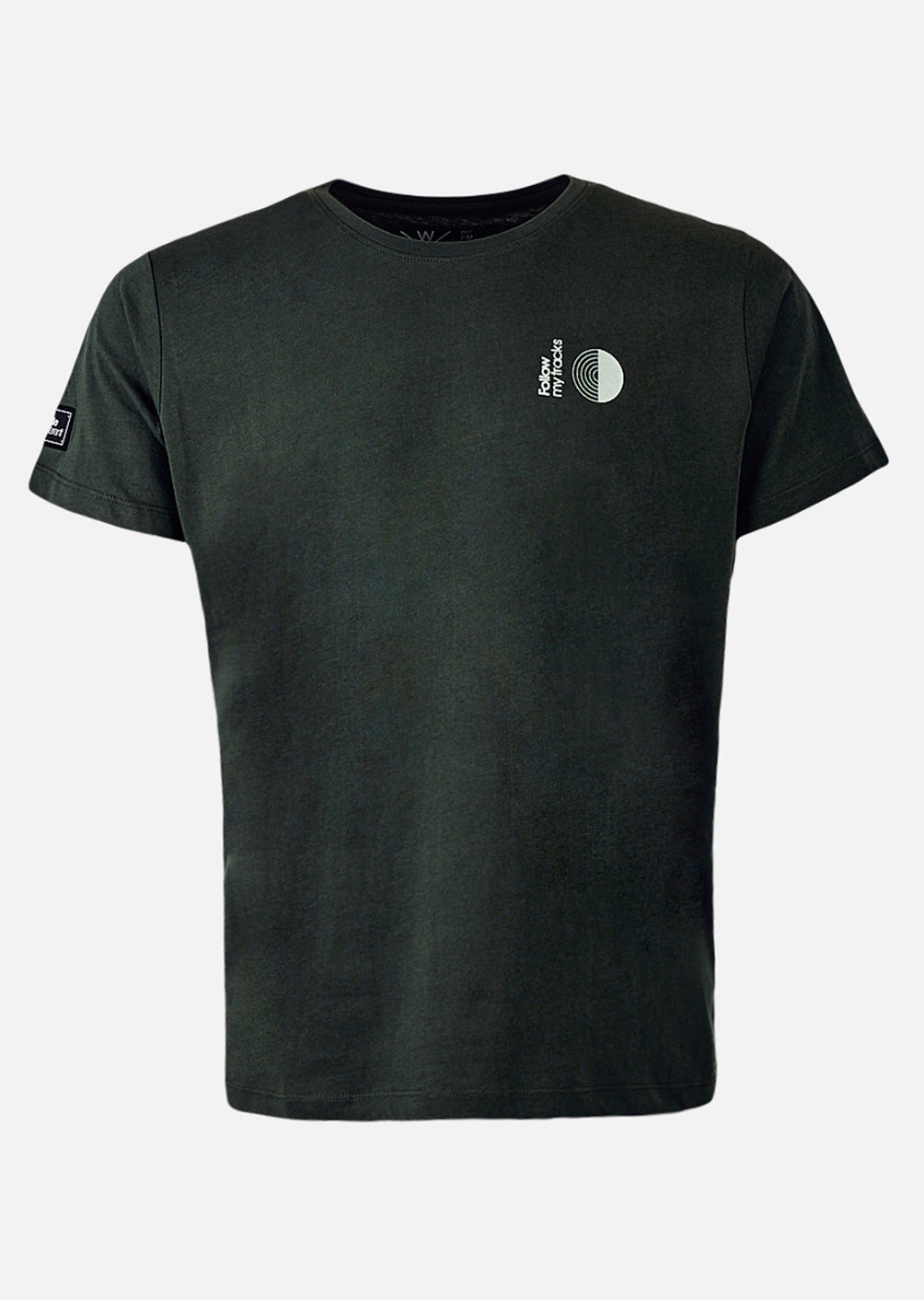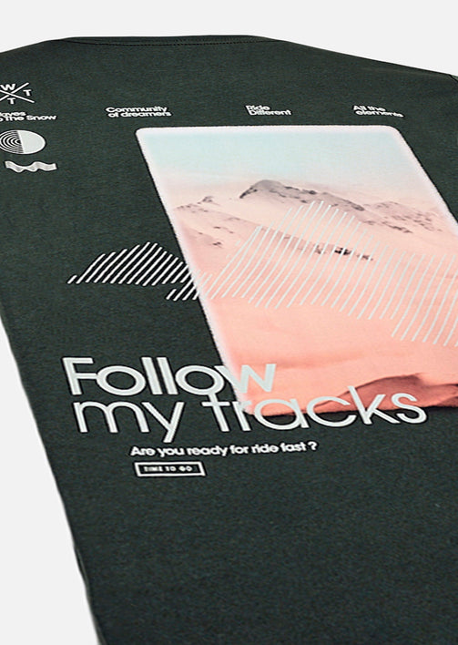 The Tracks Fir Green T-shirt features an organic, contemporary aesthetic. Its rich color highlights the central visual: a photo of a neon pink mountain ridge accompanied by a striking slogan. Made from certified organic cotton, it offers a soft feel and a good fit, even on the move. Its regular fit ensures a balanced silhouette, perfect for those who want a committed look, at the crossroads of riding and streetwear.