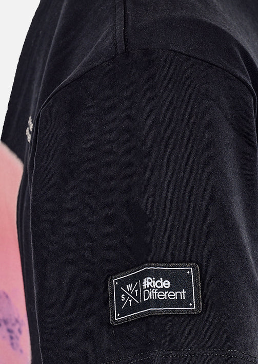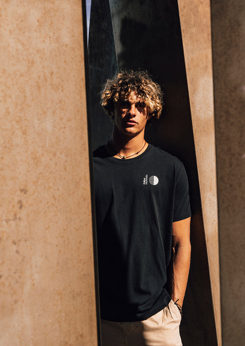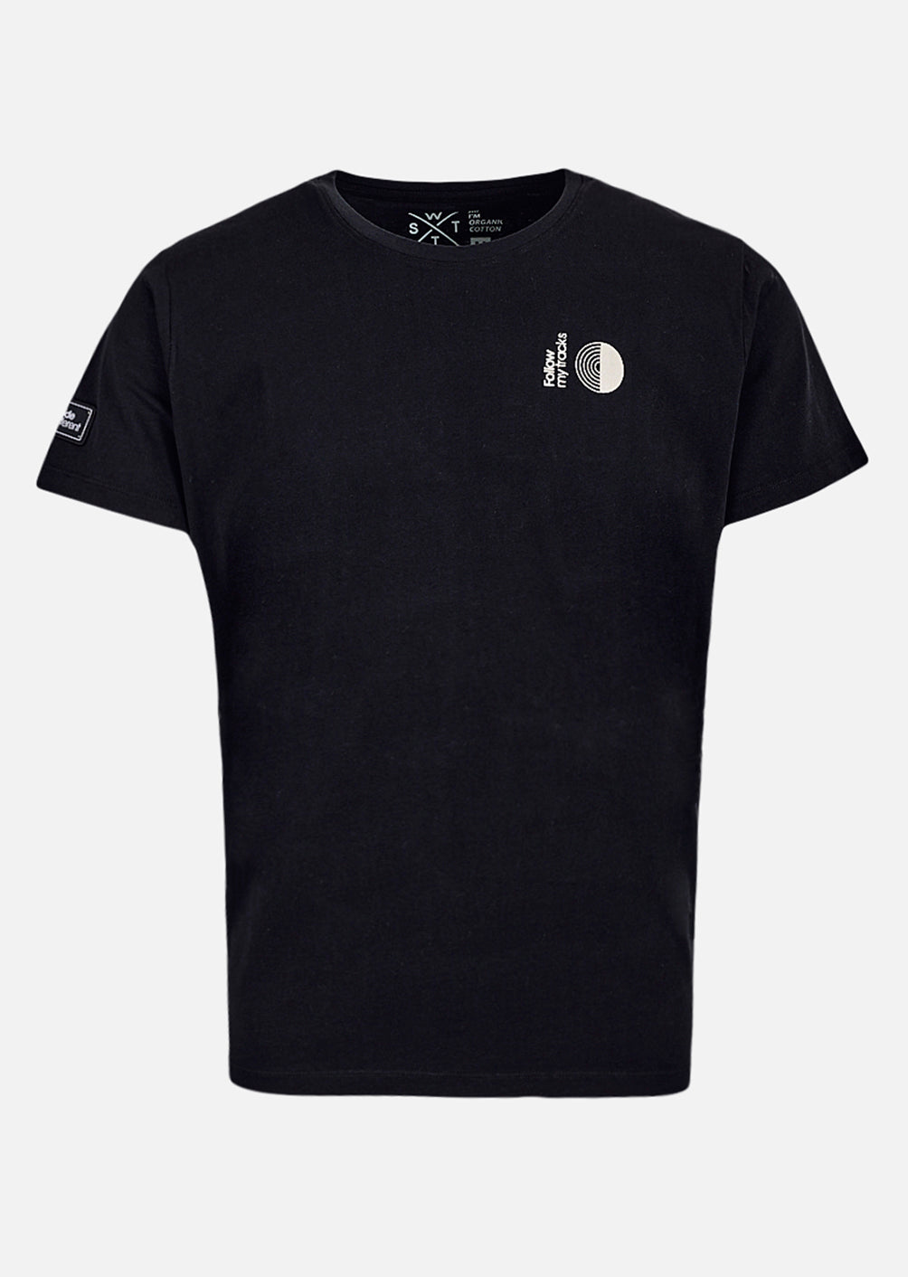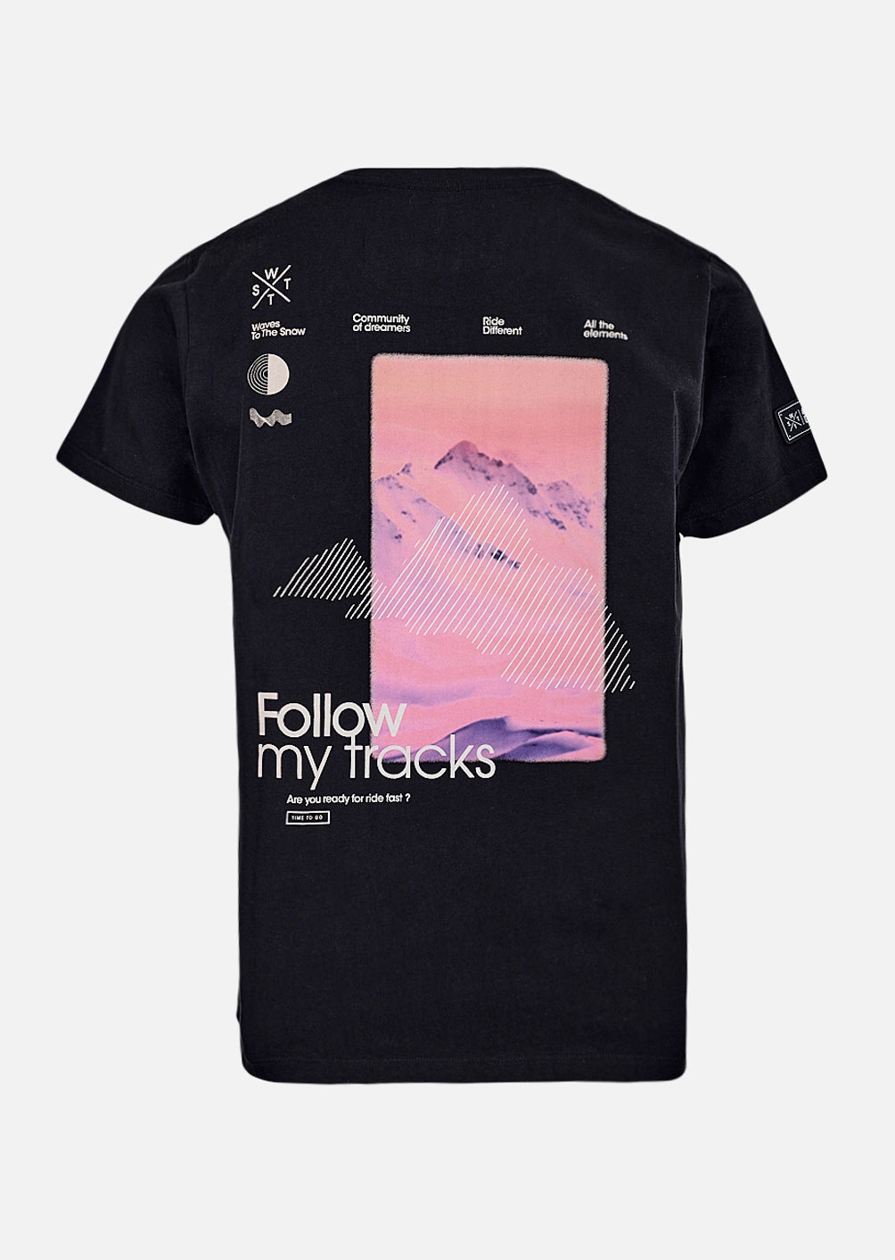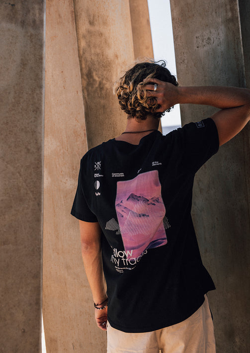 The Tracks Black T-shirt makes a strong statement with its neon "Follow my tracks" graphic that stands out powerfully against a dark background. This design embodies a raw, directional energy, inspired by the terrain and the lines we trace on it. Its organic cotton material ensures an impeccable fit and optimal comfort, while the regular cut adapts to all styles, from the most understated to the most street.