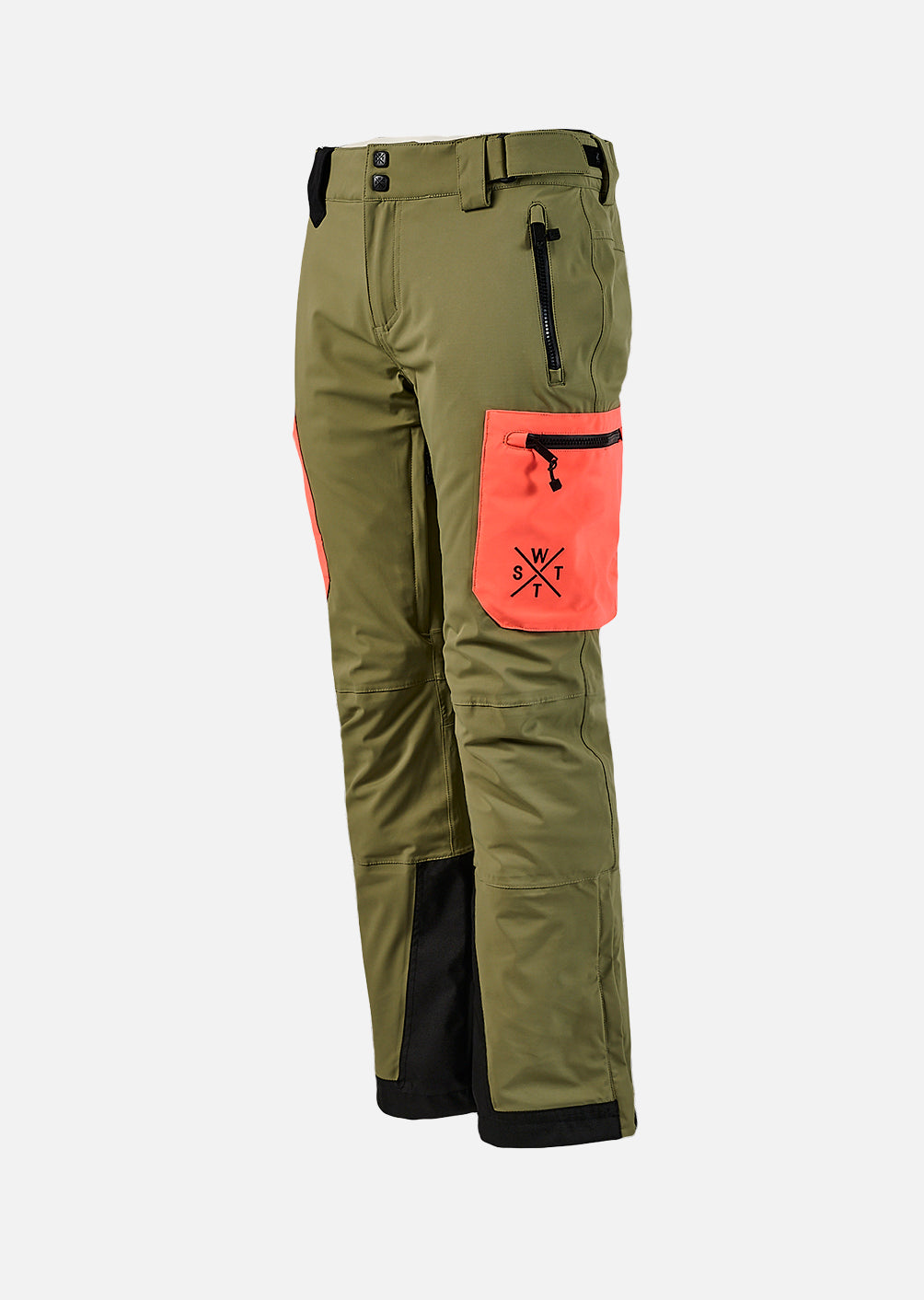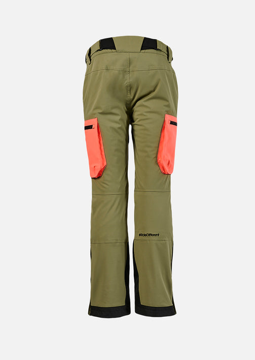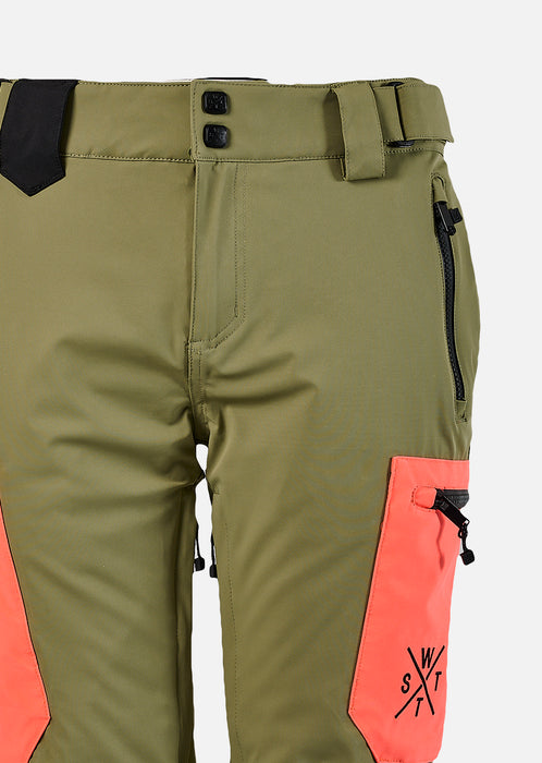 The X-Elipse Olive ski pants offer a fresh take on utilitarian style with a dynamic cargo cut and contrasting details. Perfect for female riders seeking robust technical performance and a bold look.