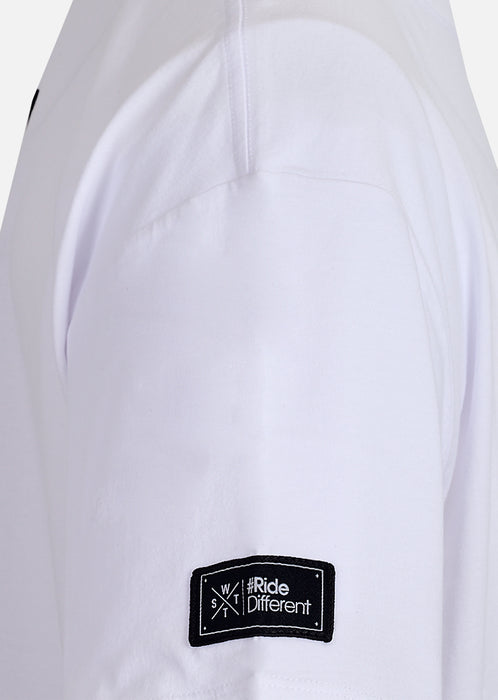 - Patch tissé appliqué et centré sur le bas de la manche droite