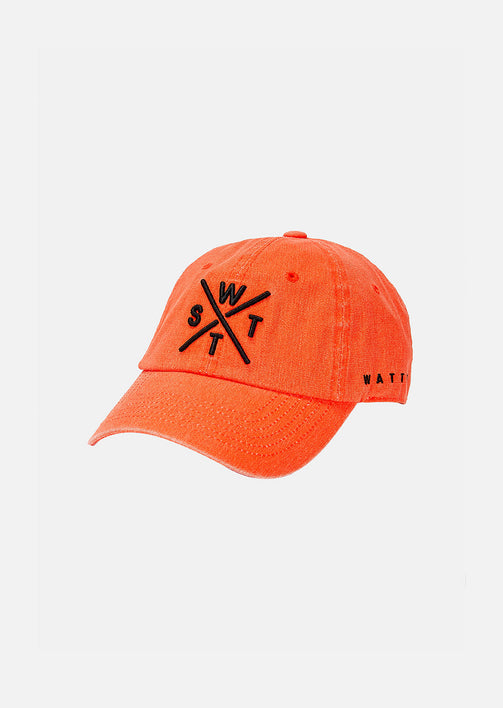 - Sur le devant : Tissu uni en Coton CANVAS avec une teinture effet usé, broderie WATTS 3D + visière