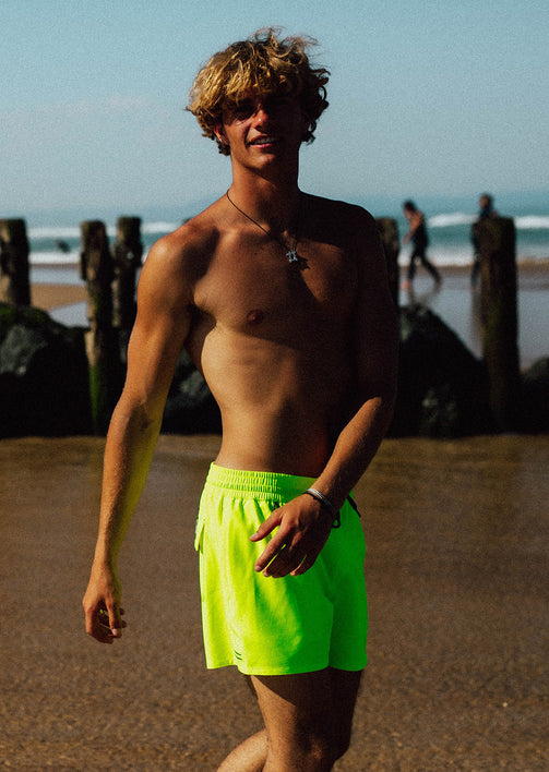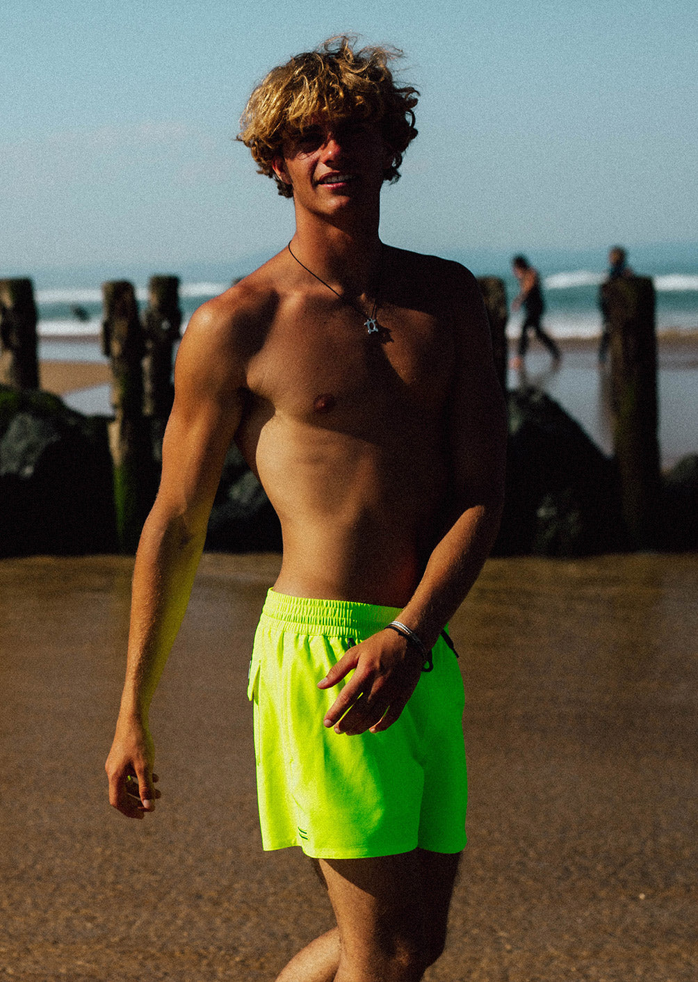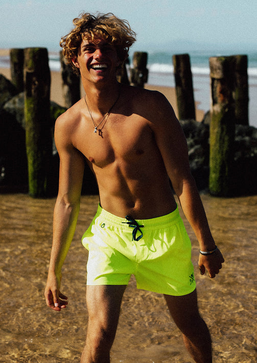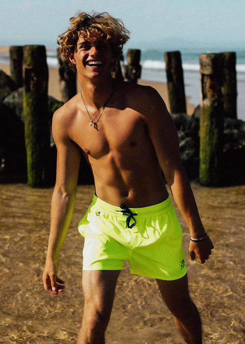Le Short de Bain R-Coolz Jaune Fluo avec ses détails Bleus incarne l’énergie solaire et la liberté. Sa couleur vive attire l'œil sans en faire trop, tandis que ses touches de bleu apportent une touche équilibrée et élégante. Conçu en tissu extensible, il offre une liberté totale pour vos sessions de surf, vos plongeons ou vos balades en bord de mer. Léger et à séchage rapide, il s’adapte à votre rythme.