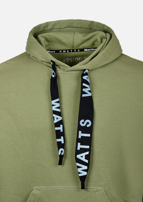 Pensé dans les moindres détails, le Tyers Olive est équipé d’une poche kangourou centrale, de bords-côtes aux poignets et à la taille pour un maintien juste, et d’une étiquette discrète WATTS sur le côté pour signer une pièce aussi sobre qu’efficace.