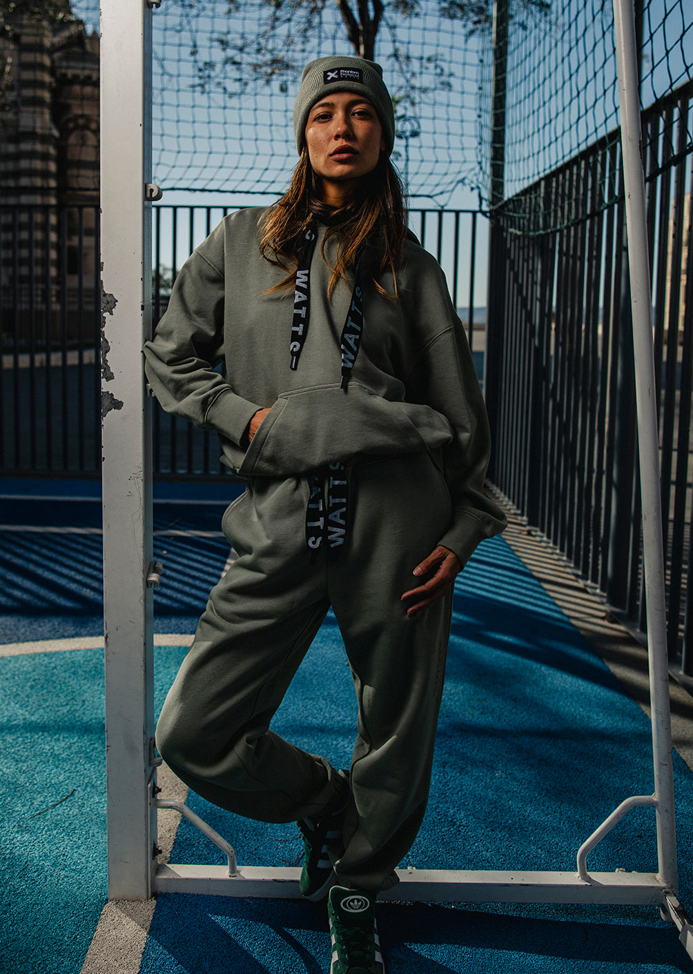 Conçu pour accompagner les journées qui bougent, ce sweat adopte une coupe droite confortable et des manches classiques pour un tombé fluide. Sa capuche doublée, resserrable grâce à un cordon personnalisé WATTS, offre une bonne protection sans alourdir la silhouette. En intérieur comme en extérieur, son molleton French Terry non gratté assure légèreté, respirabilité, et confort longue durée.