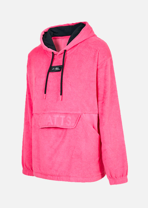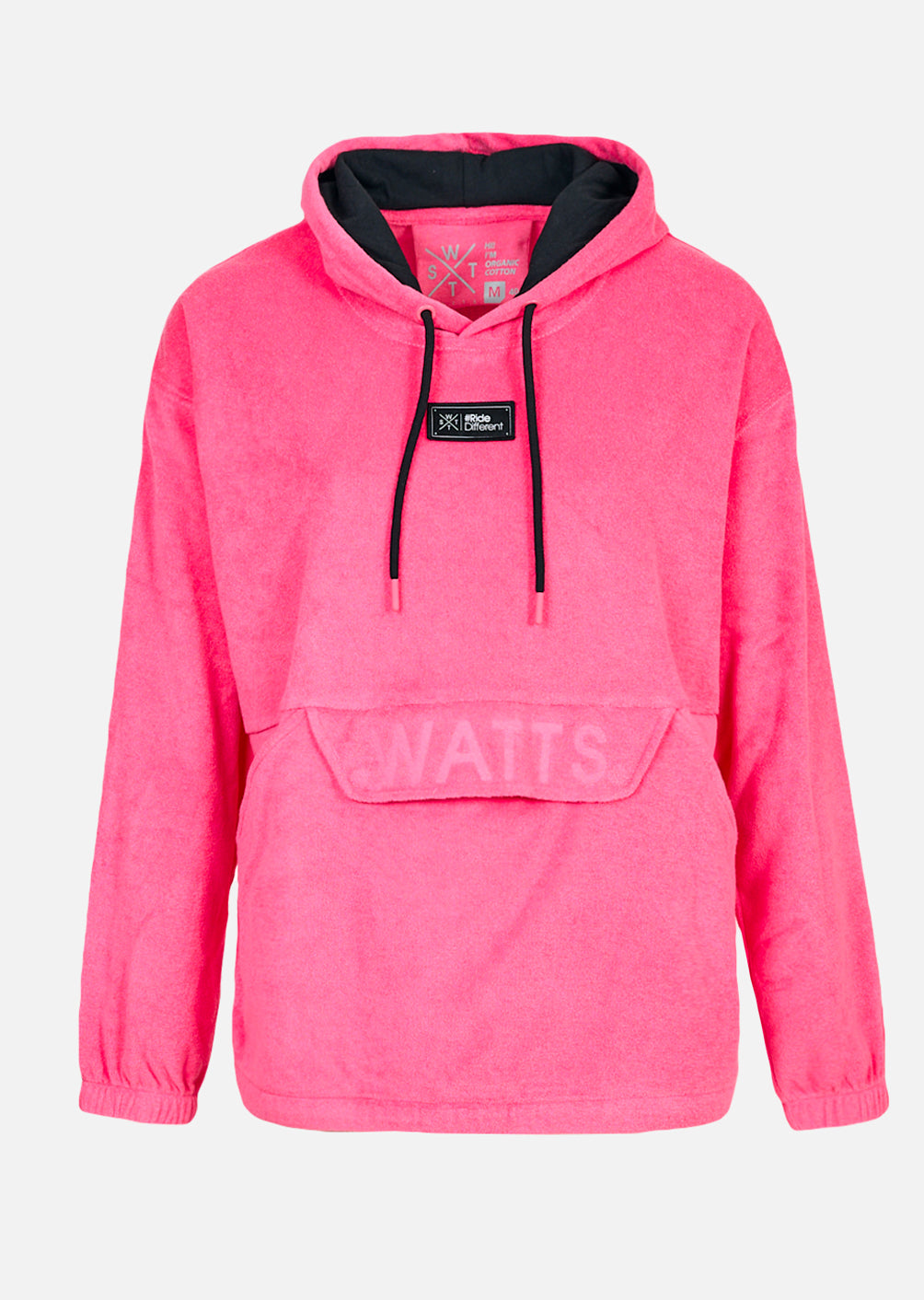 Détails et design : - Couleur vibrante : Hot Pink, pour un style pop et affirmé - Poche kangourou pratique avec rabat à boutons magnétiques, pour un look moderne et fonctionnel - Logo WATTS en relief sur la poitrine et patch tissé discret pour une finition soignée - Étiquette drapeau WATTS sur le côté gauche pour un petit détail signature - Capuche réglable avec cordon, manches droites avec poignets élastiqués et bas resserré, pour un confort optimal