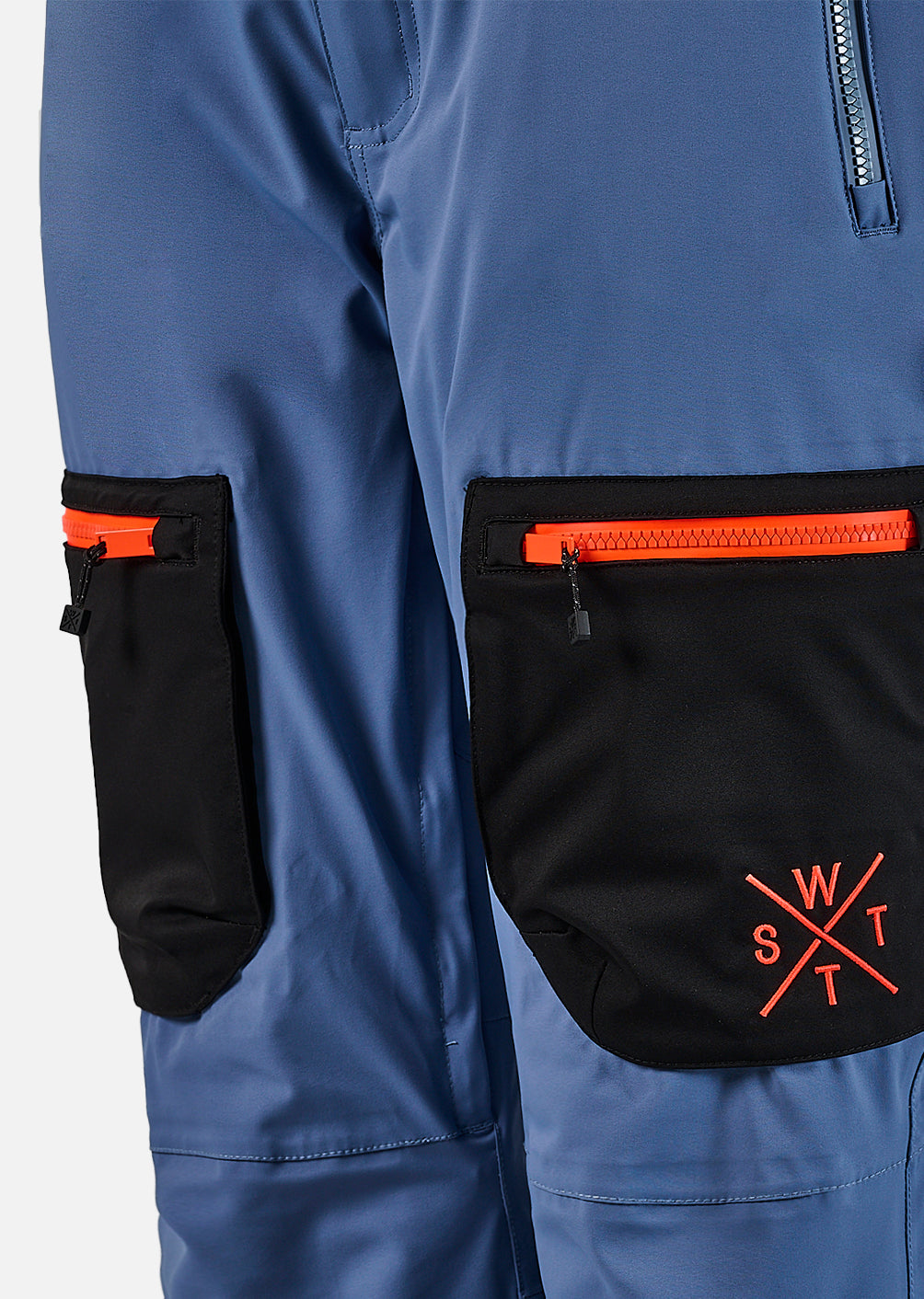 - sur le devant : 4 poches avec zips étanches ( 2 classiques aux hanches et 2 à soufflet aux cuisses )
