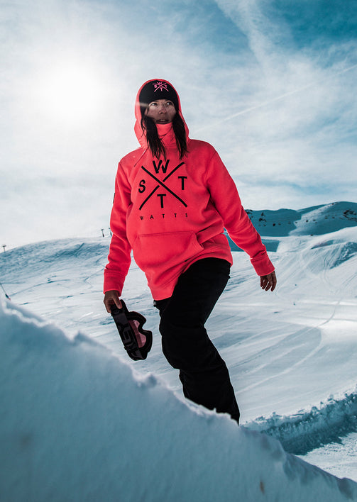 The X-Track Fluo Pink fleece sweatshirt is going to be one of our iconic sweatshirts. This piece is made from 70% recycled polyester. This hoodie is very pleasant to wear thanks to its fleece material which will protect you from the cold all winter long. It has been designed with a wide cut and breathable material so that you are comfortable in all situations. This fleece sweatshirt offers you a street look with the symbolic neon pink color of WATTS.
