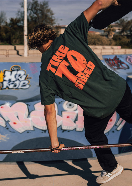 Le tee-shirt SHRED Vert Foncé combine une base sobre à une explosion visuelle dans le dos. L’orange fluo de l’imprimé "TIME TO SHRED" vient réveiller la teinte naturelle du coton, certifié organique.