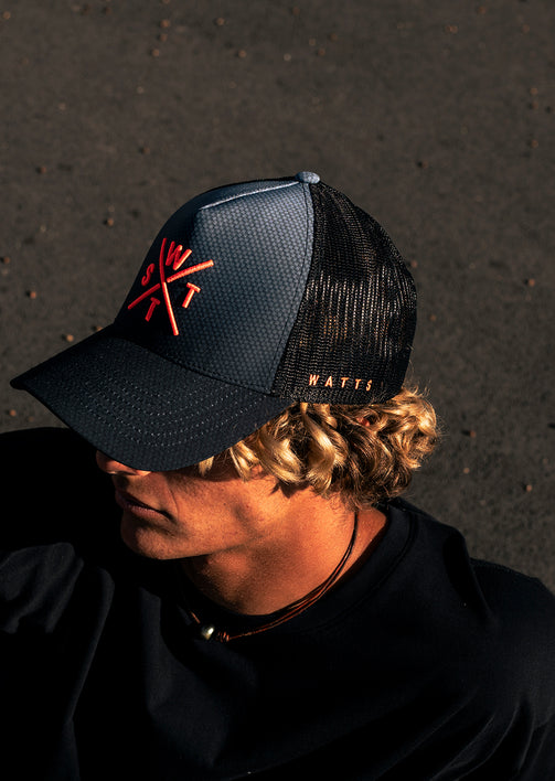 L'imprimé carbone et son dégradé de couleur à l’avant évoque les matières techniques, les surfaces qui bougent, qui vivent. Le logo brodé 3D capte juste ce qu’il faut de lumière pour signer le style sans crier. À l’arrière, le mesh respirant évacue la chaleur quand l’intensité monte sur la planche, ou en plein extérieur. Le réglage ajustable s’adapte à la seconde, pour un fit solide et confortable, même quand tu bouges vite.