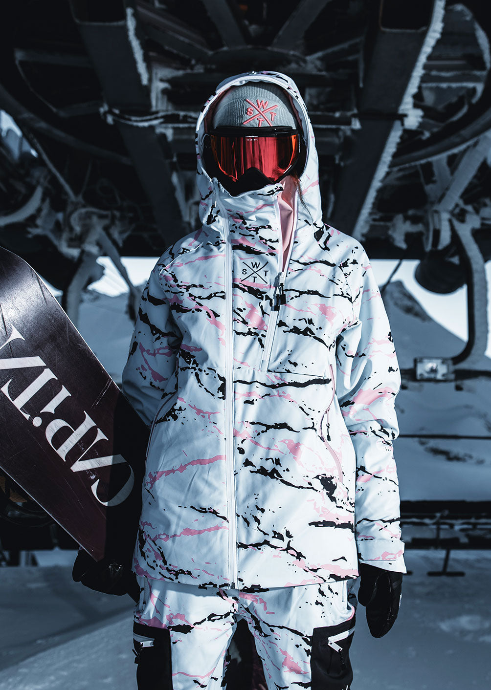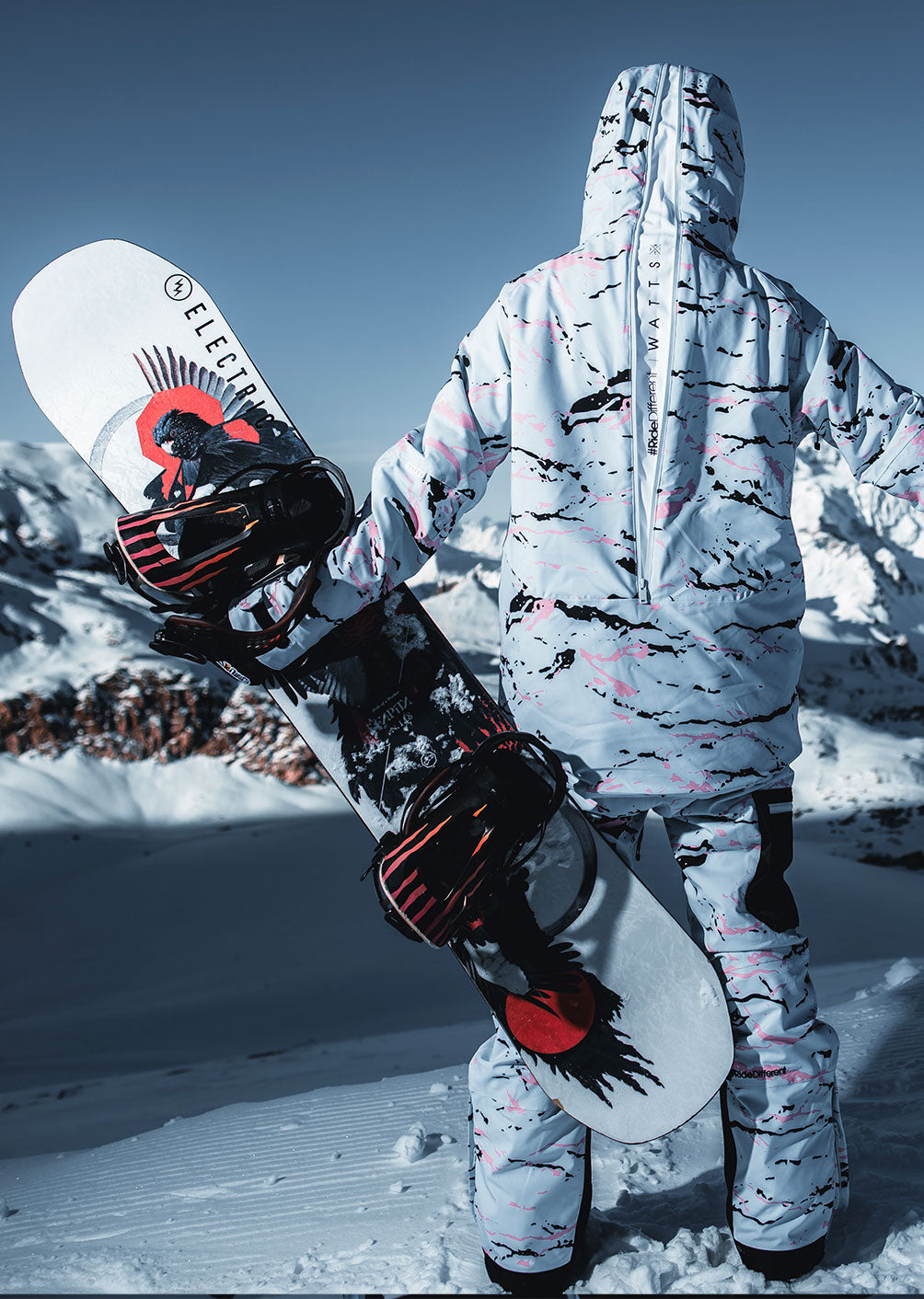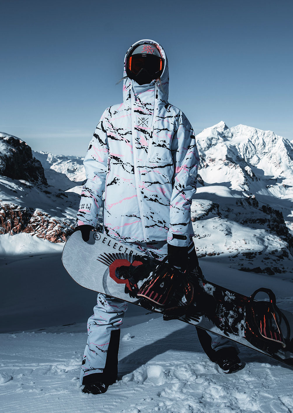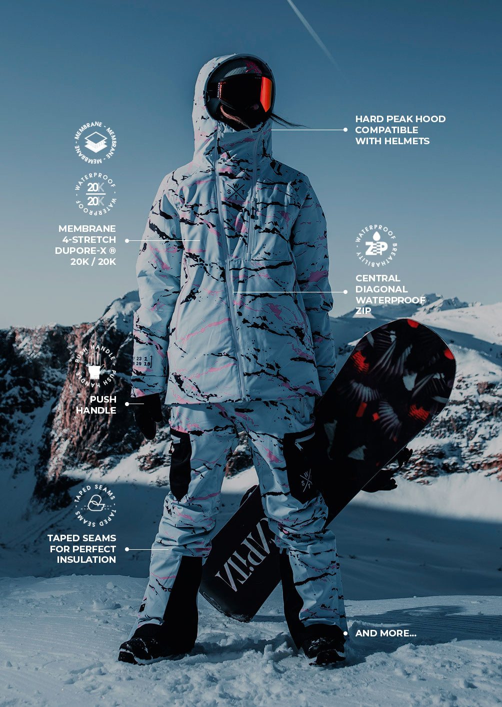 La protection est au cœur du design : col montant façon cache-cou, manchons passe-pouces, jupe pare-neige amovible — tout est pensé pour vous isoler du froid, du vent et de la neige profonde, sans jamais vous alourdir.