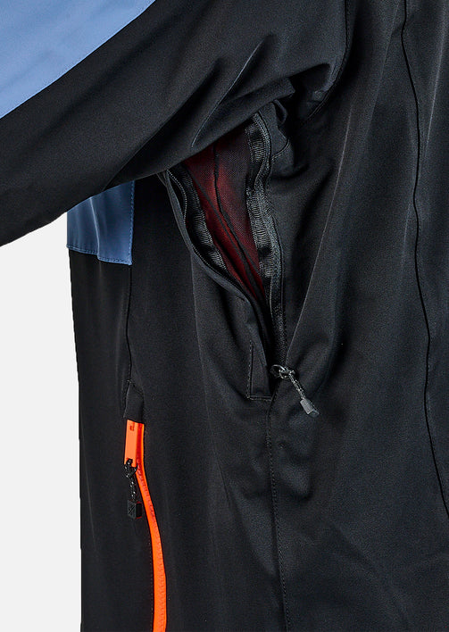 Avec ses contrastes visuels bleu gris et noir charbon -le tout réhaussé par un orange vif - la veste s’impose aussi comme une pièce forte, stylée sans excès, au design structuré et intemporel.