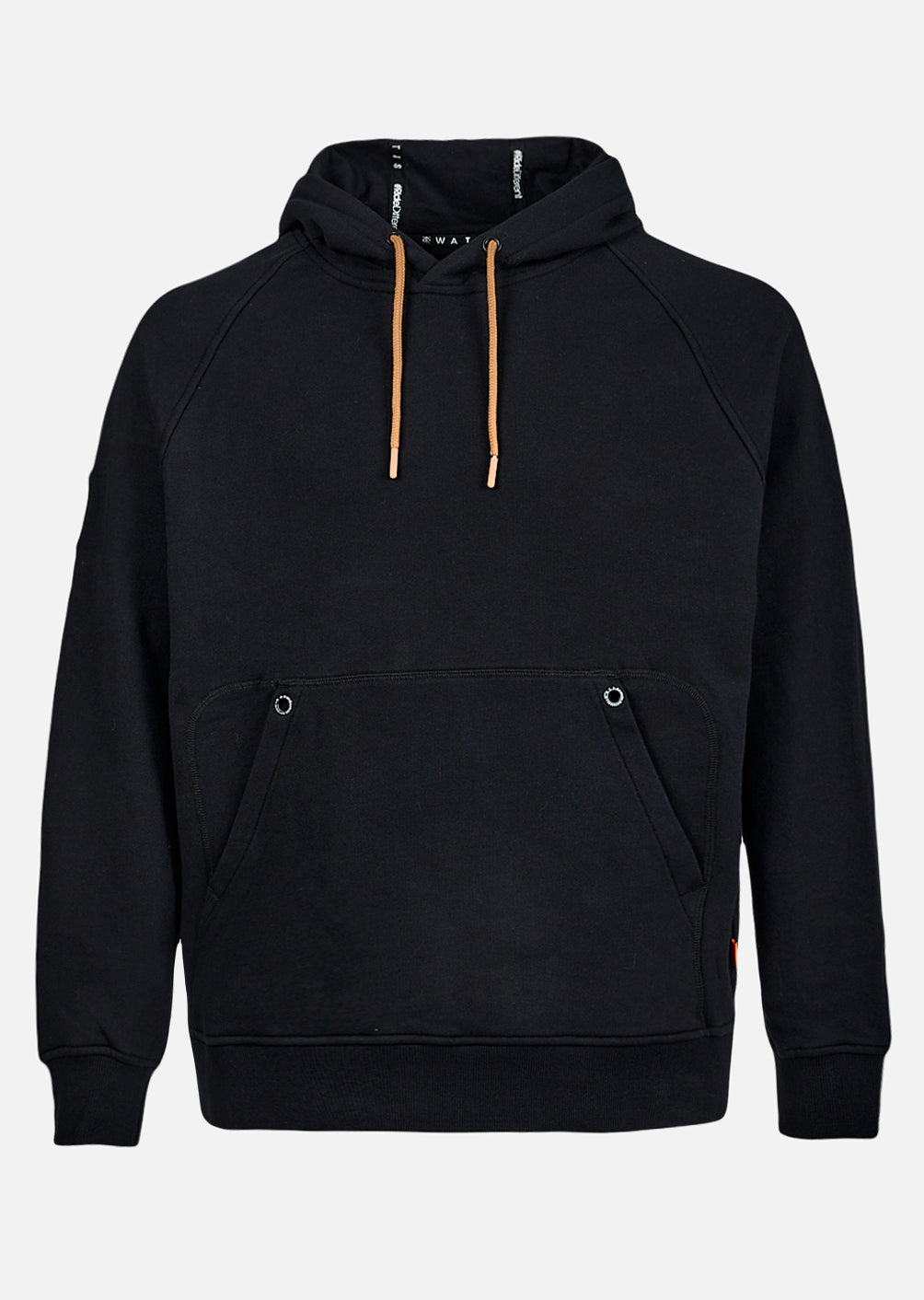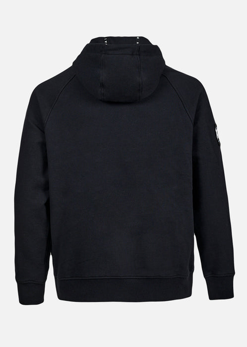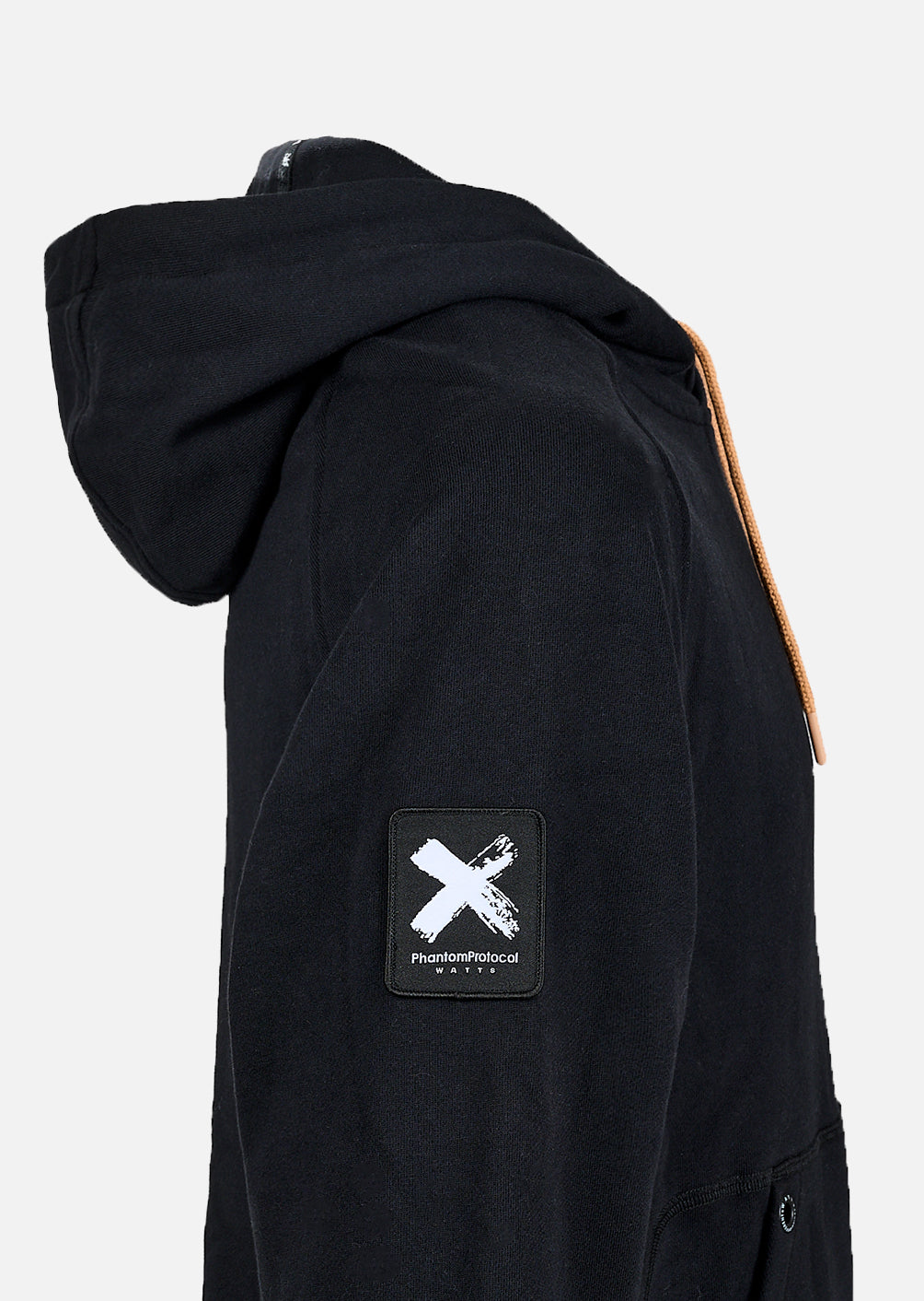 Sa teinte noire profonde est accentuée par des finitions soigneusement étudiées : cordon de serrage ton sur ton avec embouts métalliques, poche kangourou pratique avec détails de coutures, et patch discret signature Phantom Protocol cousu sur la hanche. Le tissu lavé lui apporte un effet légèrement usé, pour un look naturellement vintage et travaillé.