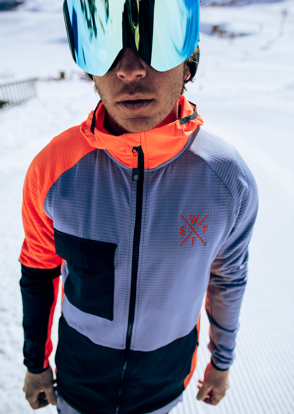 La Veste sous couche technique X-POWDER combine technologie textile et esthétique tranchée. Sa teinte bleu gris contrastée par des empiècements orange fluo et noirs apporte une vraie personnalité à cette seconde couche thermique.