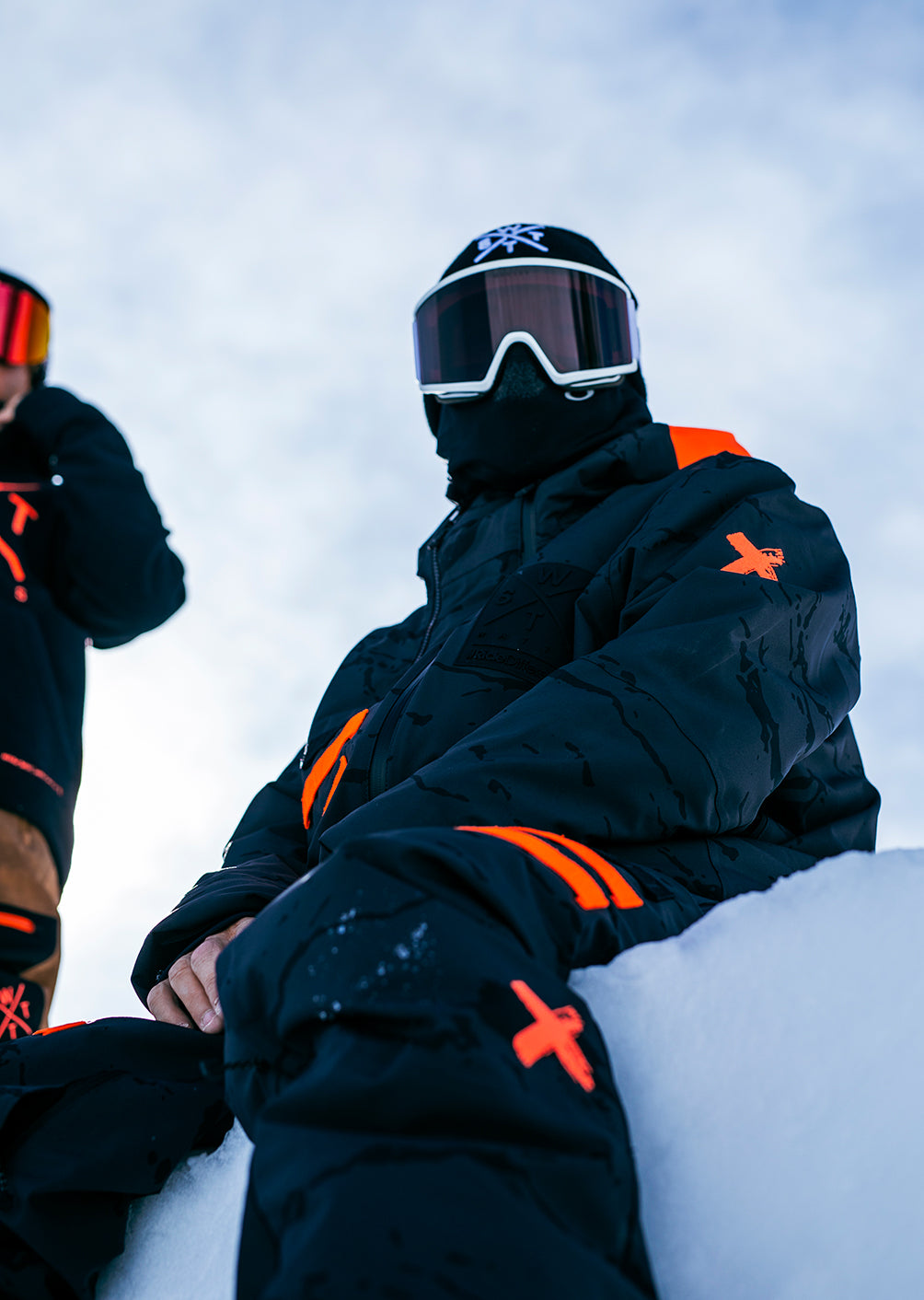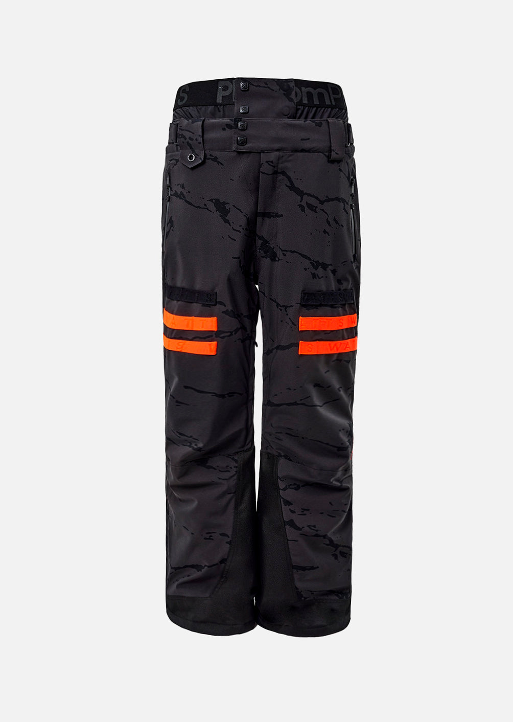 Sa durabilité et son adaptabilité — les renforts bas de jambe et les boutons-pression personnalisés protègent des frottements et prolongent la durée de vie, pendant que la boucle pour lunettes, la poche latérale et les bandes jacquard oranges contrastées (prêtes à accueillir la sacoche X-Pocket) offrent un rangement sécurisé et une configuration pratique selon la session — piste, park ou hors-piste.