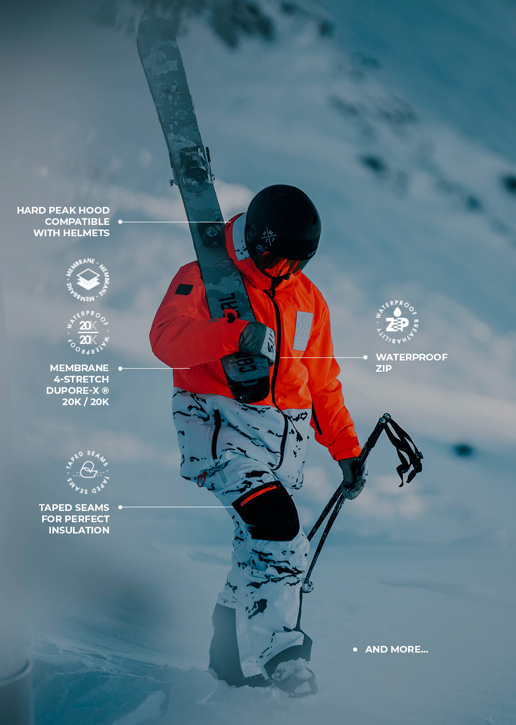Mais sous ce design structuré se cache une veste ultra-technique, conçue pour résister, protéger et performer. Dotée de la membrane Dupore-X® 20K/20K 4-Stretch, elle offre une imperméabilité et une respirabilité exceptionnelles, idéales pour les longues journées en hors-piste, la poudreuse profonde et les sessions intenses. Sa matière stretch vous garantit une liberté de mouvement maximale dans toutes les situations, même les plus physiques.