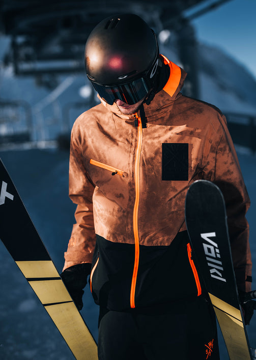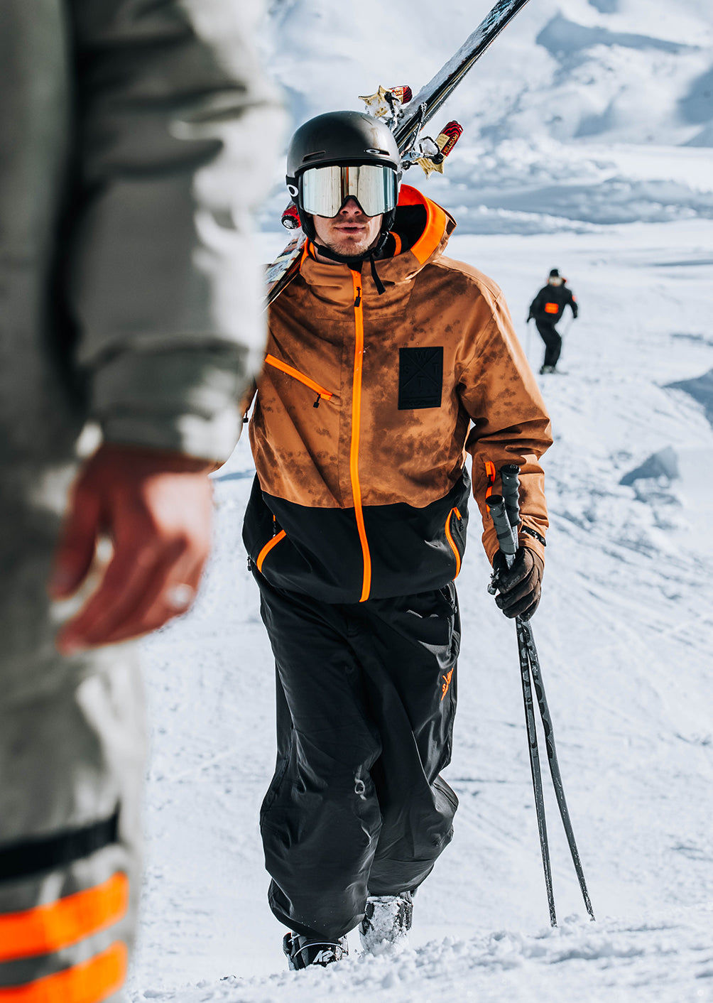 Une veste Marron Tie & Dye, profonde, texturée, avec membrane 20k/20k pour les riders qui vivent dehors, à fond.
