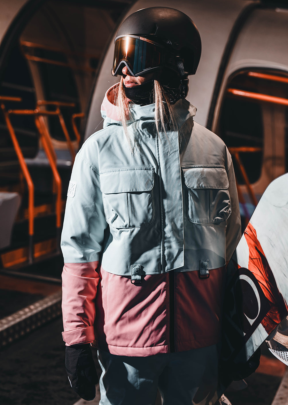Le design est marqué par des pochettes cargo pratiques sur la poitrine, des détails techniques invisibles mais efficaces : capuche réglable, zips étanches, pare-neige, poignets ergonomiques… Tout est pensé pour la performance et le confort au quotidien.
